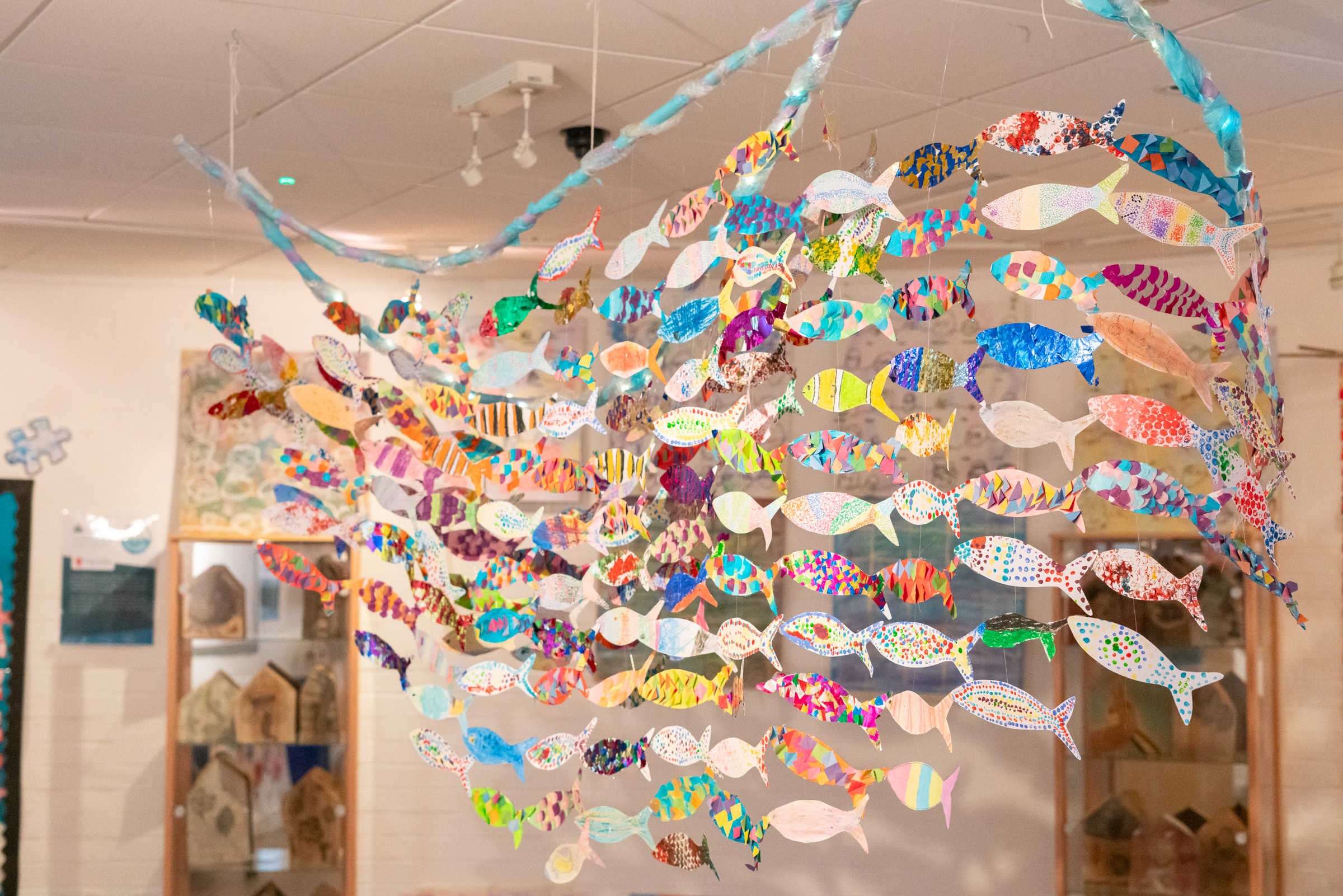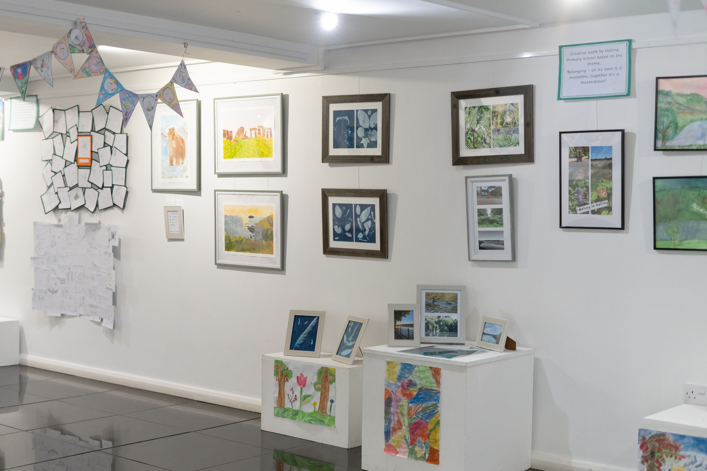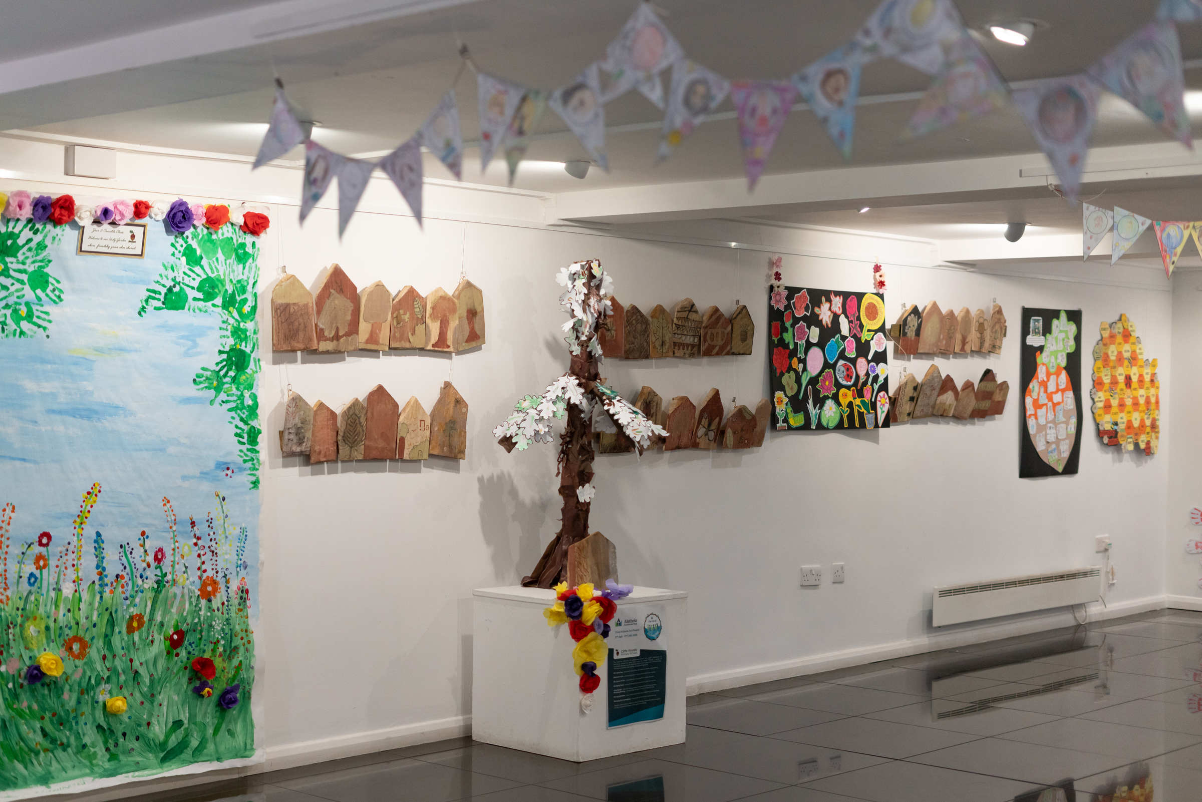 - Rosherville C of E Academy and Whitehill Primary School contributed expressive group artwork: trees, fish, flowers, and stars, each element part of something bigger.